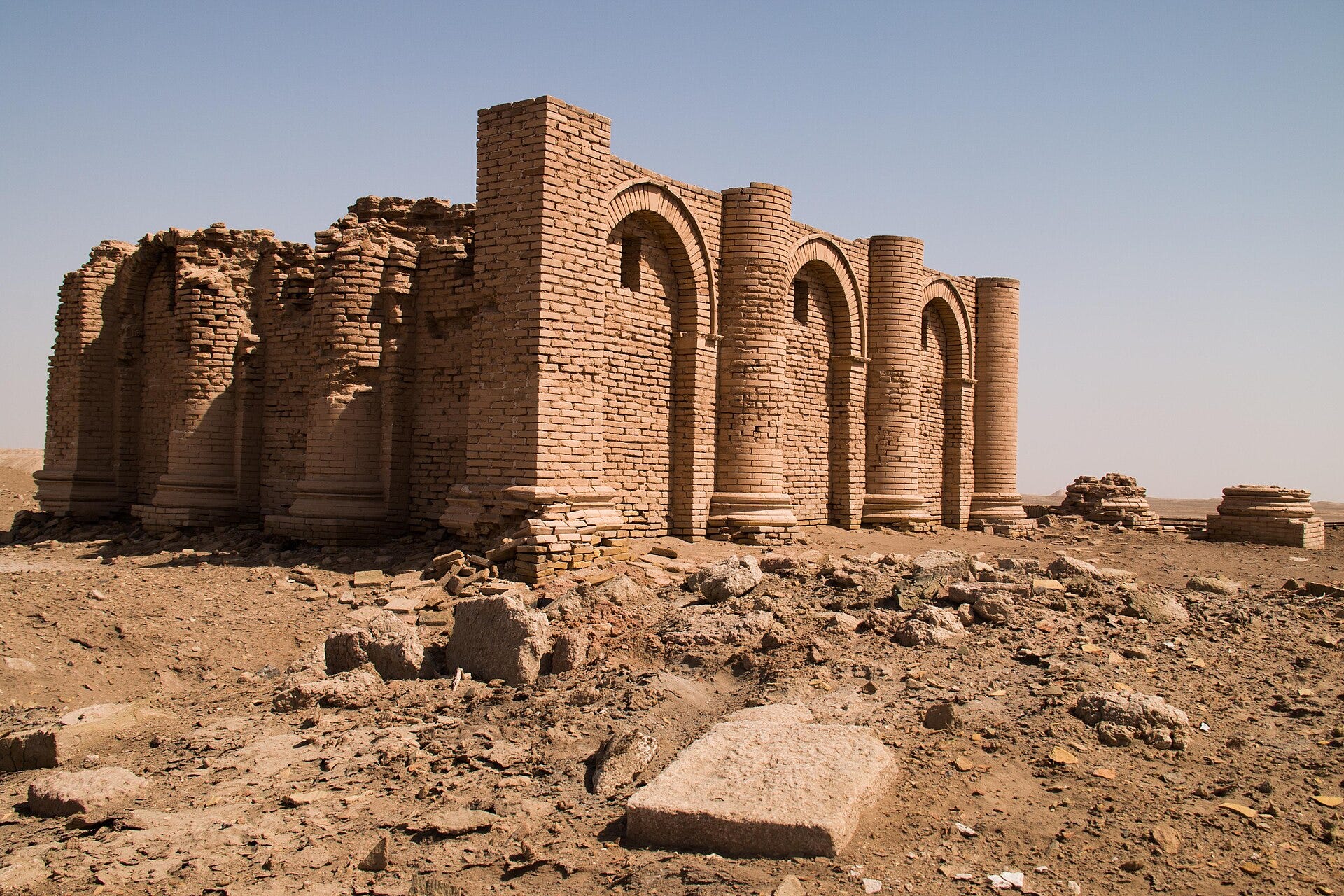 → Parθavan Temple of Gareus4 in Uruk, Al-Warka, Muthanna Governorate, Iraq. This temple is built entirely of burnt brick. The dimensions are 10.7 × 13.7 metres. The original height of the structure is unknown, but the surviving ruins of the structure are >8m high. The exterior was decorated with four half-columns with Ionic capitals and vaulted niches in between. In front of the temple's facade, there was a series of 6 columns. (Built c. 110 CE) [Source: https://en.wikipedia.org/wiki/Temple_of_Gareus]