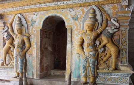 Gatekeepers at entrance of Asgiriya Gedige Raja Maha Viharaya in Kandy, Central Province, Sri Lanka [Source: Asgiri Maha Viharaya and the Adahanamaluwa Gedige Viharaya in Kandy | AmazingLanka.com]