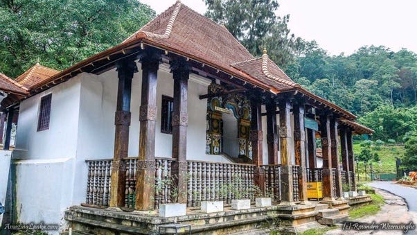 Main temple of Asgiriya Gedige Raja Maha Viharaya in Kandy, Central Province, Sri Lanka — the entrance porch is made my extending the lower roof and supporting it by pillars [Source: Asgiri Maha Viharaya and the Adahanamaluwa Gedige Viharaya in Kandy | AmazingLanka.com]