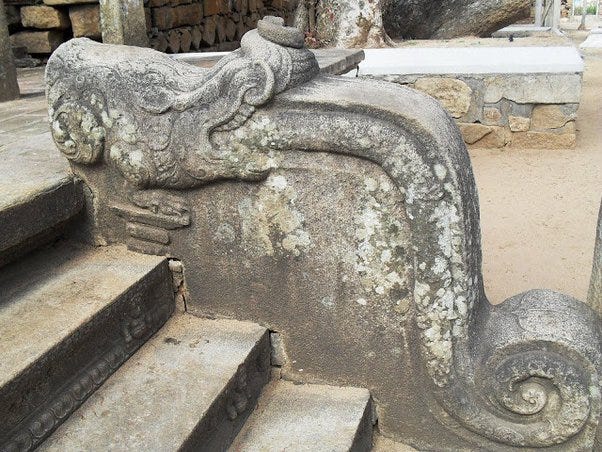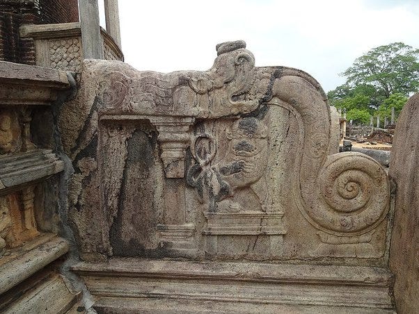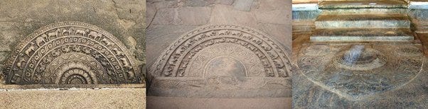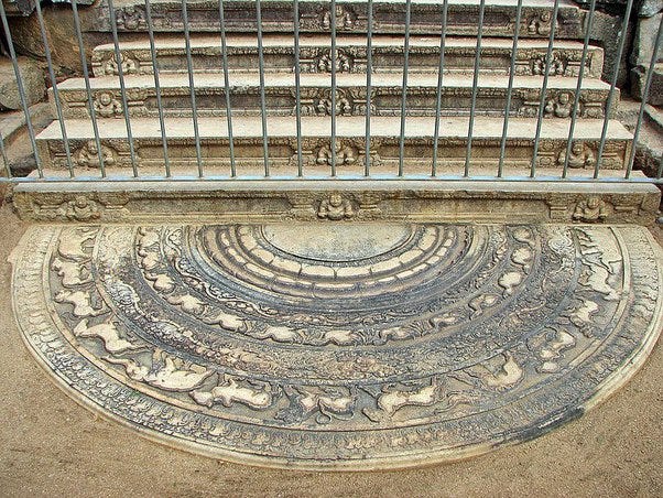 San̆dakaḍa pahaṇa at the entrance to Polonnaruwa Vatadage of Dalada Maluva, Polonnaruwa, Polonnaruwa District in North Central Province, Sri Lanka. Note the absence of the bull and lion. During Poḷonnaruwa period, the bull was removed from San̆dakaḍa pahaṇa, and the remaining animals were depicted in separate bands; in some cases lion was also removed. San̆dakaḍa pahaṇa started to be placed at entrances of non-Buddhist buildings. [Source: File:Polonnaruwa-temple19.jpg - Wikimedia Commons]