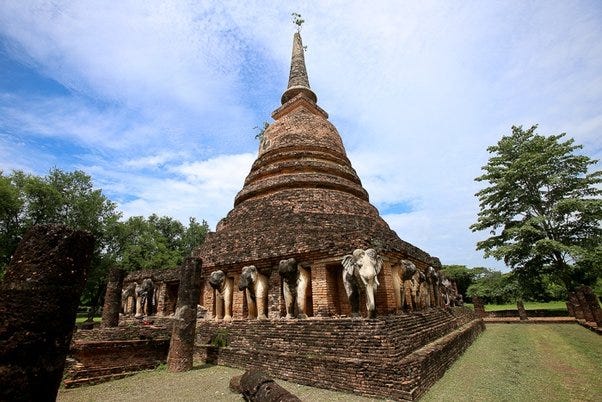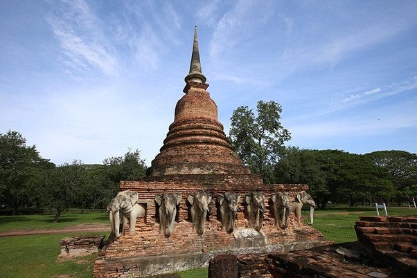Wat Chang Lom (Temple Surrounded by Elephants) in Sukhothai, Thailand — the name refers to the 32 elephant sculptures that surround the base of the main stūpa (Built late 14th century CE) [Source: Wat Chang Lom, Sukhothai, Thailand]