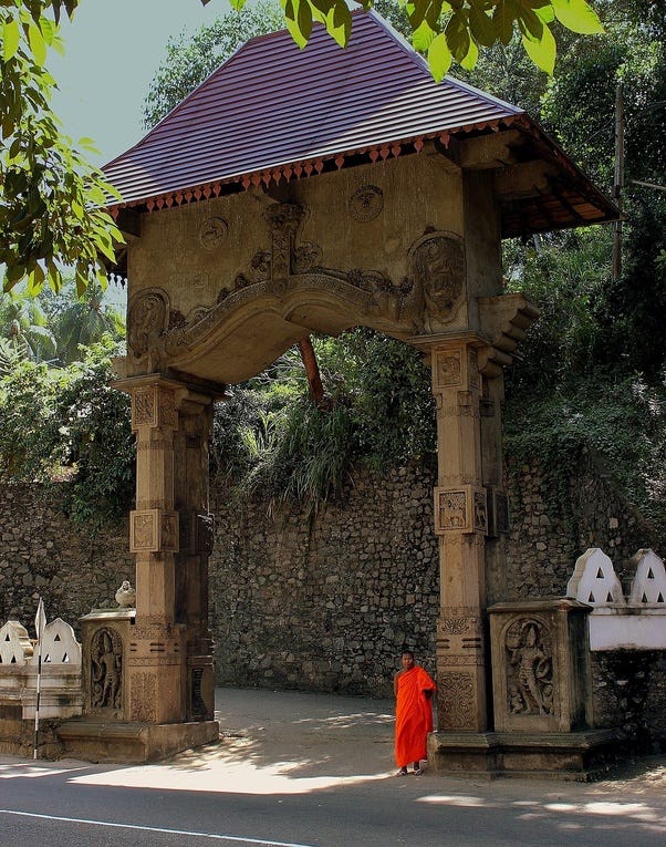 Gateway of Malwathu Maha Viharaya in Kandy, Central Province, Sri Lanka — features a Makara-Tōraṇa shaped entrance and flanked by muragala. [Source: File:MONASTRY AT KANDY LAKE SRI LANKA JAN 2013 (8900839218).jpg - Wikimedia Commons]