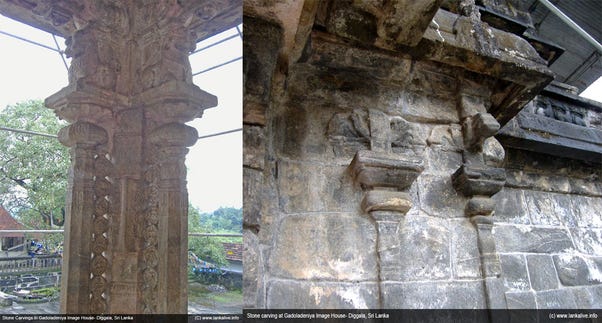 Engaged pillars and decorative pillars reminiscent of Drāviḍa style at Gadaladeniya Raja Maha Viharaya [Source: Gadaladeniya Rajamaha Viharaya | AmazingLanka.com]