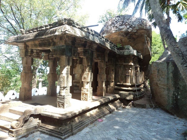 Waraka Welandu Viharaya at Ridi Viharaya Complex in Ridigama, Kurunegala District, North Western Province, Sri Lanka — this temple resembles Drāviḍa style Sanatanist temples in some regards, and may reflect the enduring Drāviḍa architecture influence over Sinhala architecture after Cōḻa rule had ended. (Built Poḷonnaruva period) [Source: File:Waraka Welandu Viharaya Ridi Viharaya.JPG - Wikimedia Commons]