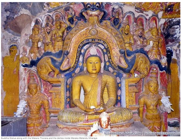 Makara-Tōraṇa framing the Buddha in Waraka Welandu Viharaya at Ridi Viharaya Complex in Ridigama, Kurunegala District, North Western Province, Sri Lanka [Source: Makara Torana - The Dragons Arch | AmazingLanka.com]