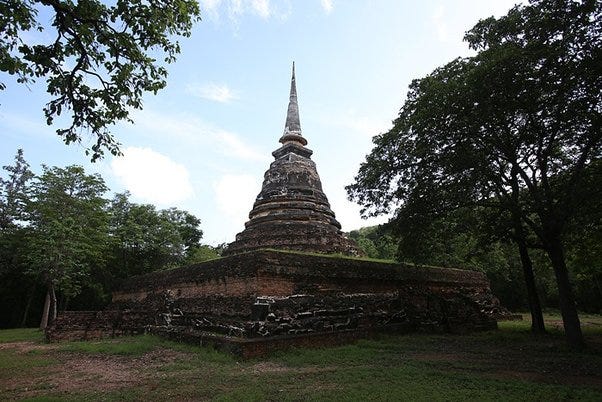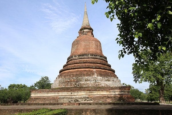 Wat Chana Songkhram (Temple of Victory) in Sukhothai, Thailand — Its bell-shaped profile and tall, ringed spire is strongly influenced by Sri Lankan designs. (Built likely 14th century CE) [Source: Wat Chana Songkhram, Sukhothai, Thailand]