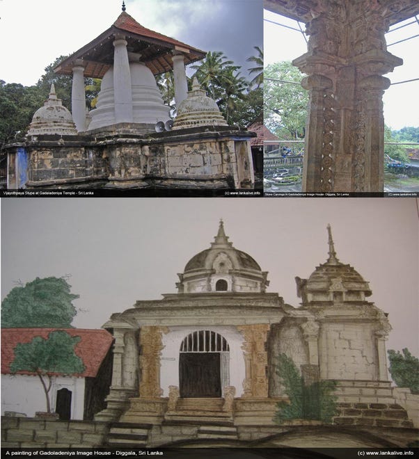 Dharma Kirthi Viharaya (Gadaladeniya Vihara) in Pilimathalawa, Kandy, Sri Lanka — incorporates features from Drāviḍa architecture like the design of pillars and some decorative features. This temple complex’s chief architect was a south Indian named Ganēśvarācārī. (Built 1344 CE under Bhuvanaikabāhu IV of Gampola kingdom) [Source:Gadaladeniya Rajamaha Viharaya | AmazingLanka.com]
