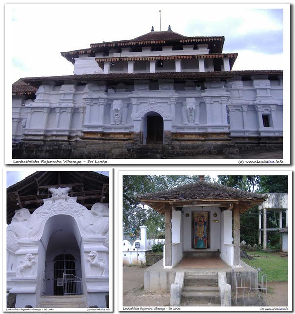 Lankatilaka Raja Maha Viharaya in Udunuwara, Kandy district, Central Province, Sri Lanka — features Makara-Tōraṇa motif entrance (bottom left) and many Drāviḍa style decorations over the walls. (Built under Bhuvanaikabāhu IV of Gampola kingdom) [Source: Lankatilaka Raja Maha Viharaya | AmazingLanka.com]