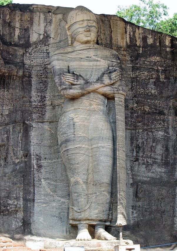 Maligawila Buddha statue in Maligawila village, Moneragala District, Uva Province, Sri Lanka (Built 7th century CE under prince Aggabōdhī) [Source: File:Standing Buddha Statue Maligawila.jpg - Wikimedia Commons]