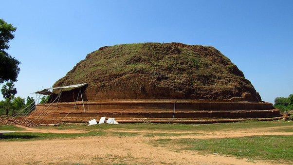 → Stūpa of Dighavapi monastic complex in Ampara District of Eastern Province, Sri Lanka [Source: File:Dighavapi - 2016-08-18.jpg - Wikimedia Commons]