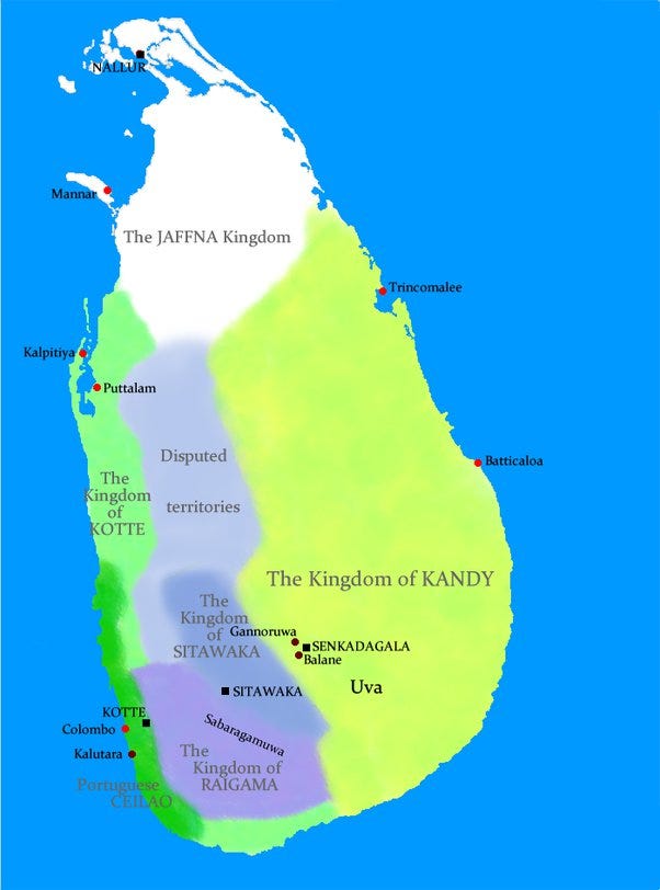 → Sri Lankan polities c. 1520s CE [Source: File:Sri Lanka geopolitics, 1520s.png - Wikimedia Commons]
