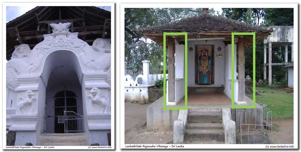 Makara-Tōraṇa motif on main entrance and octagonal chamfered columns on shrine in Lankatilaka Raja Maha Viharaya [Source: Lankatilaka Raja Maha Viharaya | AmazingLanka.com]